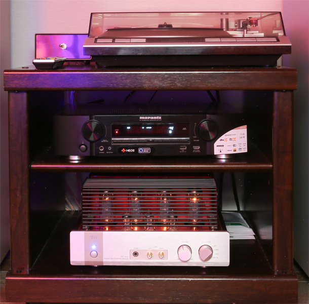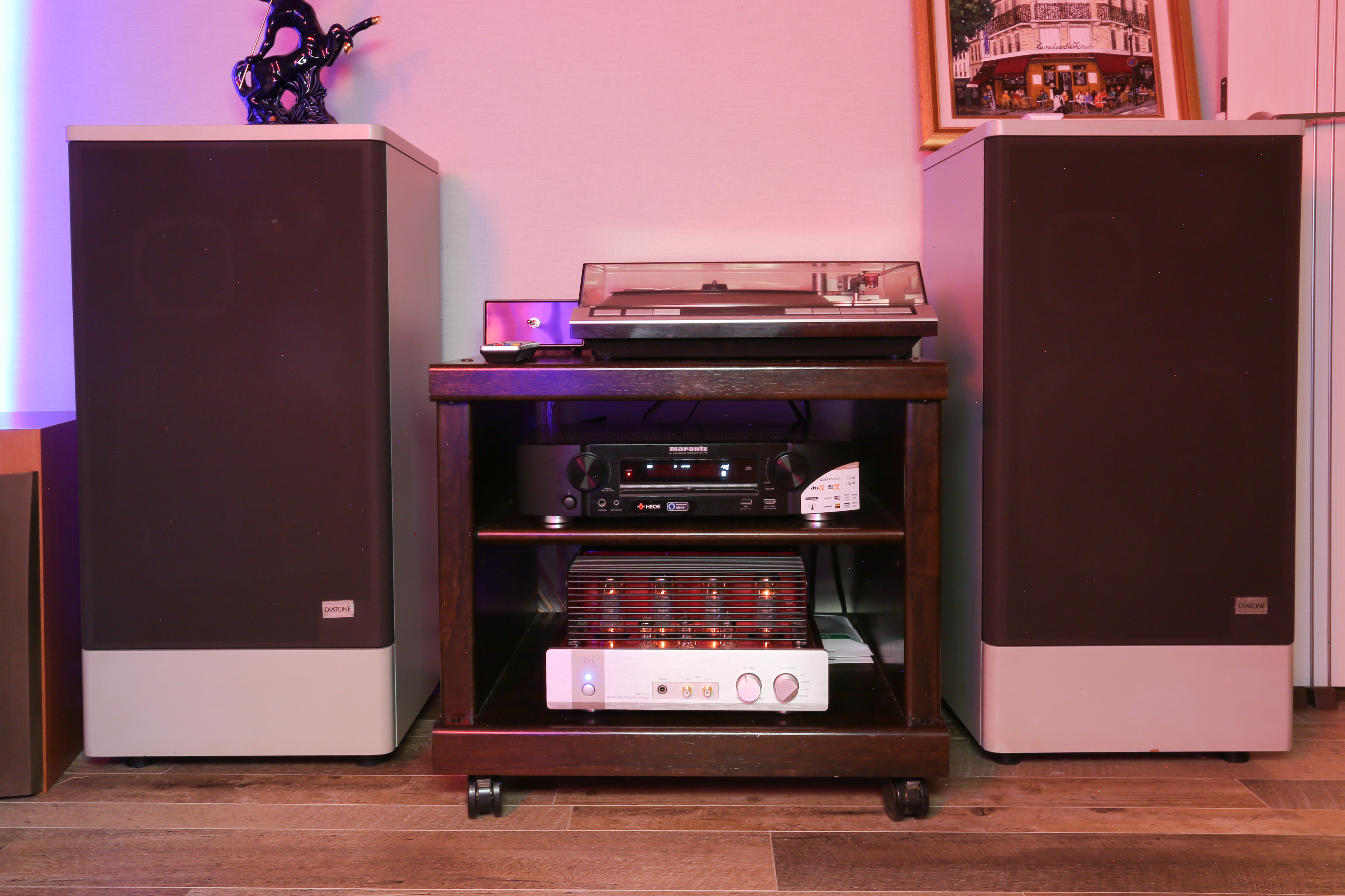 店内右壁に大きめのスピーカーと再生ユニットが鎮座する