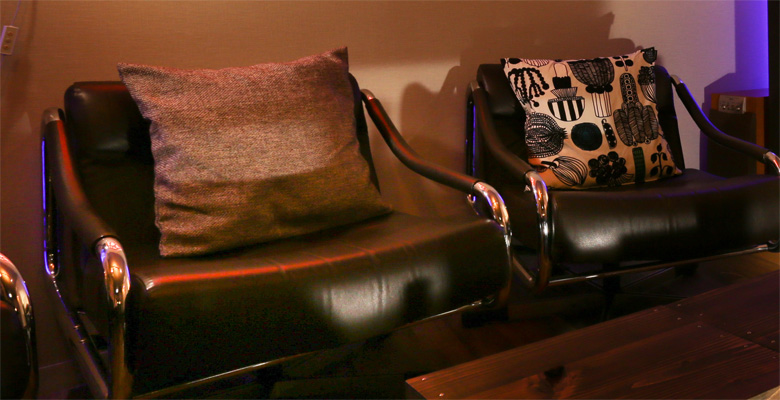 環八を背にするフロアにはミースがデザインしたバルセロナチェアとソファー3脚の合計5脚がありくつろげる -